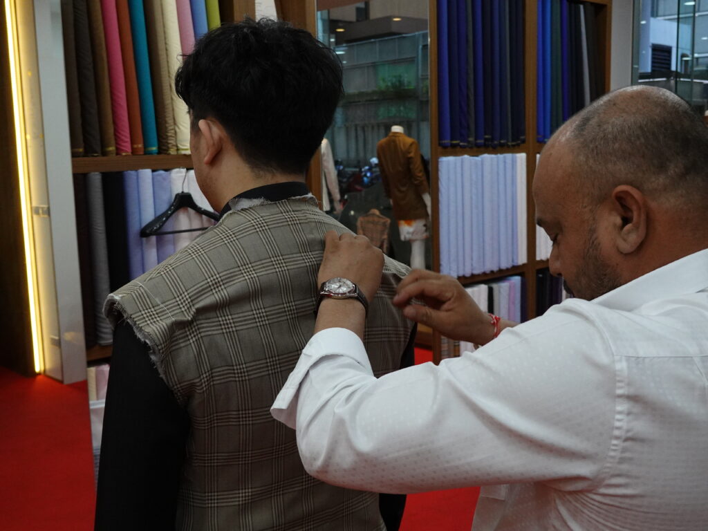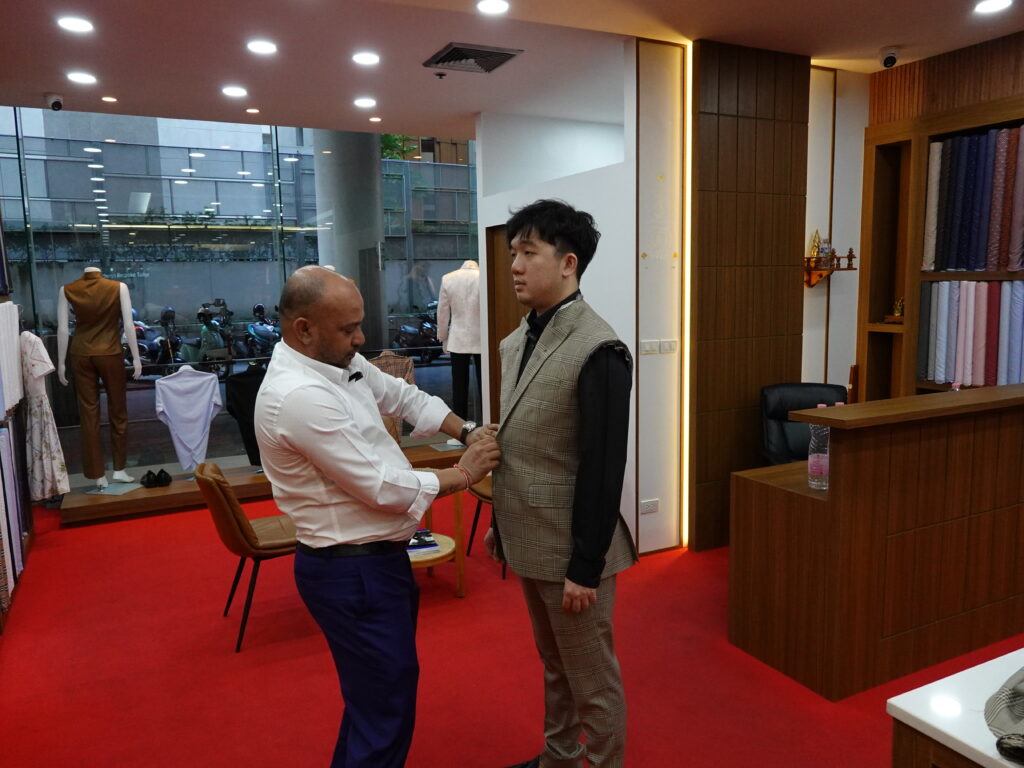 Throughout the basted fitting, Anthony took a notably hands-on approach—at one point even getting down on his knees to ensure the trouser length was precisely dialled in. This contrasts with many Bangkok tailoring houses, where a dedicated jacket fitter typically handles fittings. At Anthony Bespoke Tailor, it is very much a one-man operation, with Anthony drawing on over 25 years of experience to personally oversee every aspect of the client’s tailoring journey.