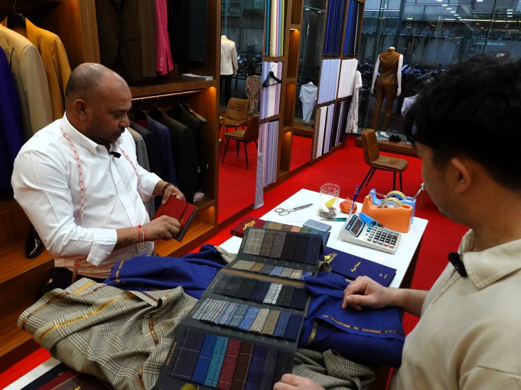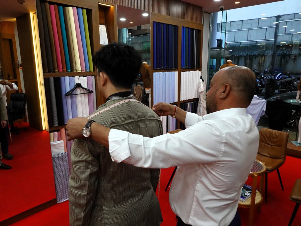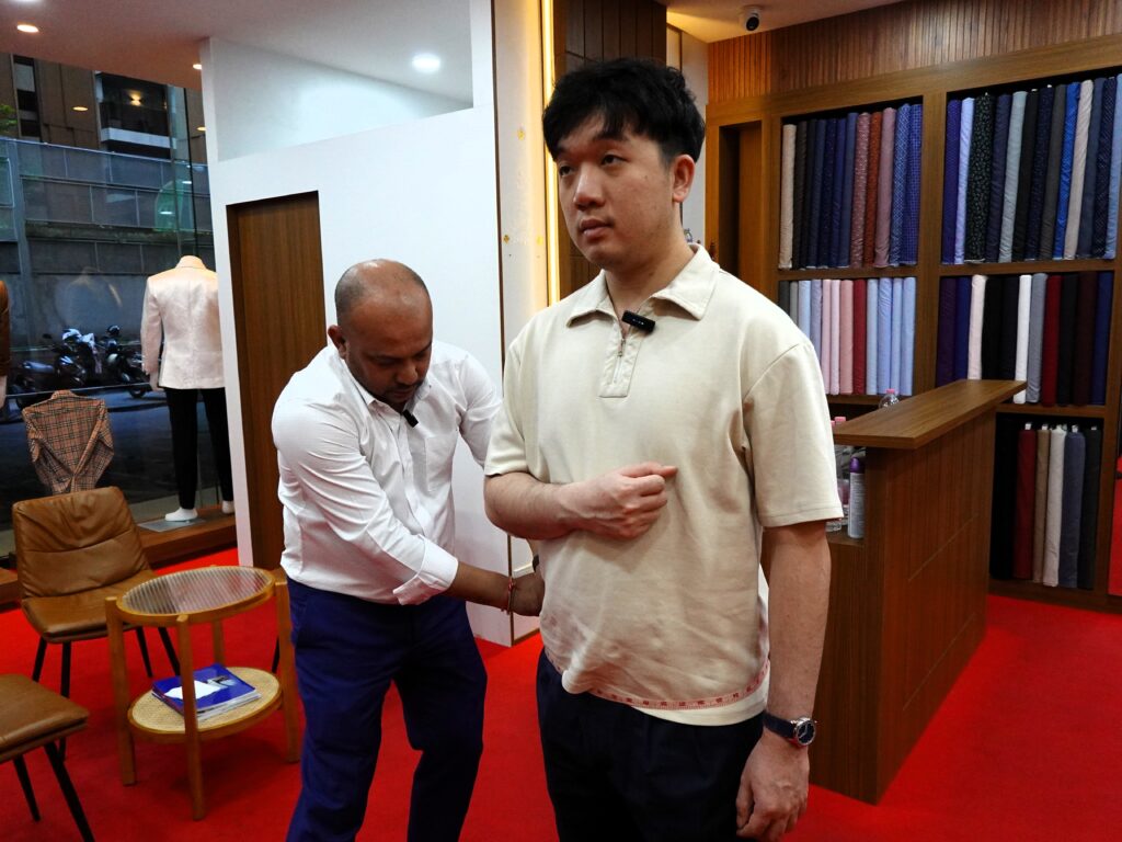 With the fabrics settled, we moved on to the measurement process. As noted earlier, Anthony brings over 25 years of experience—having previously worked with several Bangkok tailoring houses before establishing Anthony Bespoke Tailor—and it showed in the assured, practised way he handled the measuring tape.
