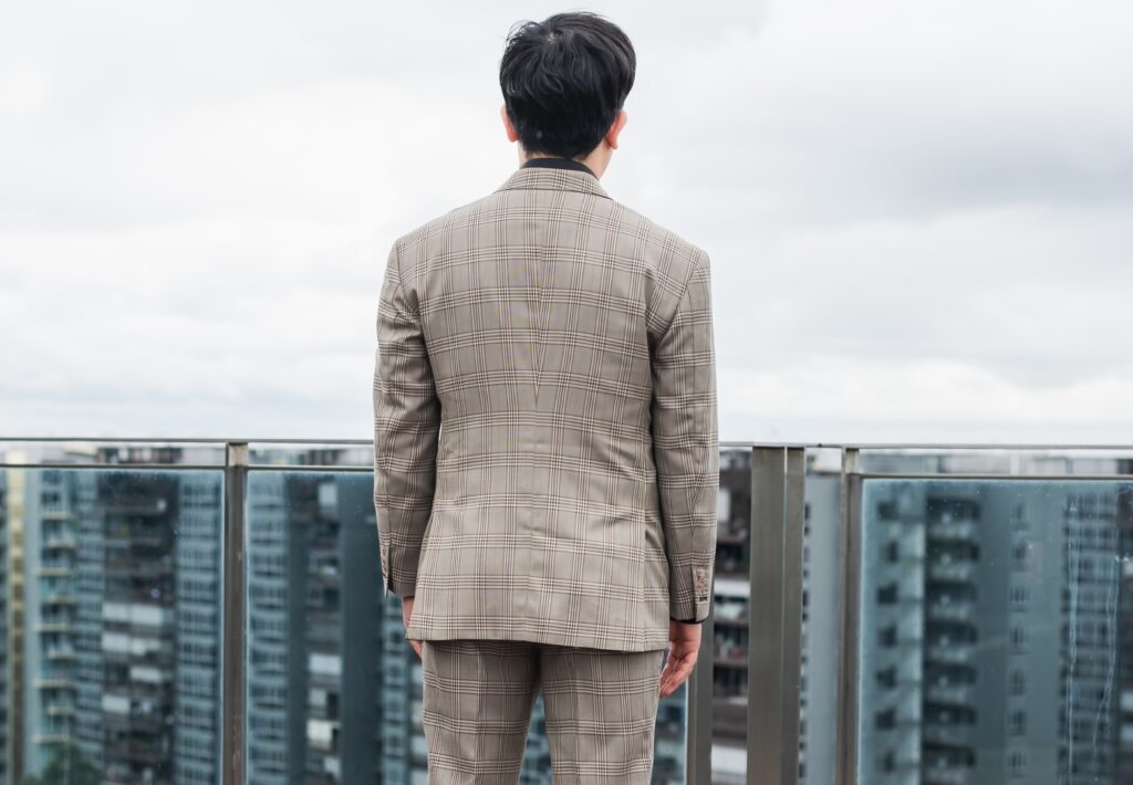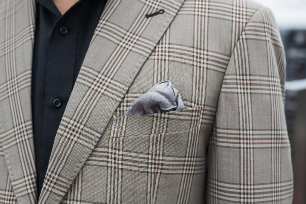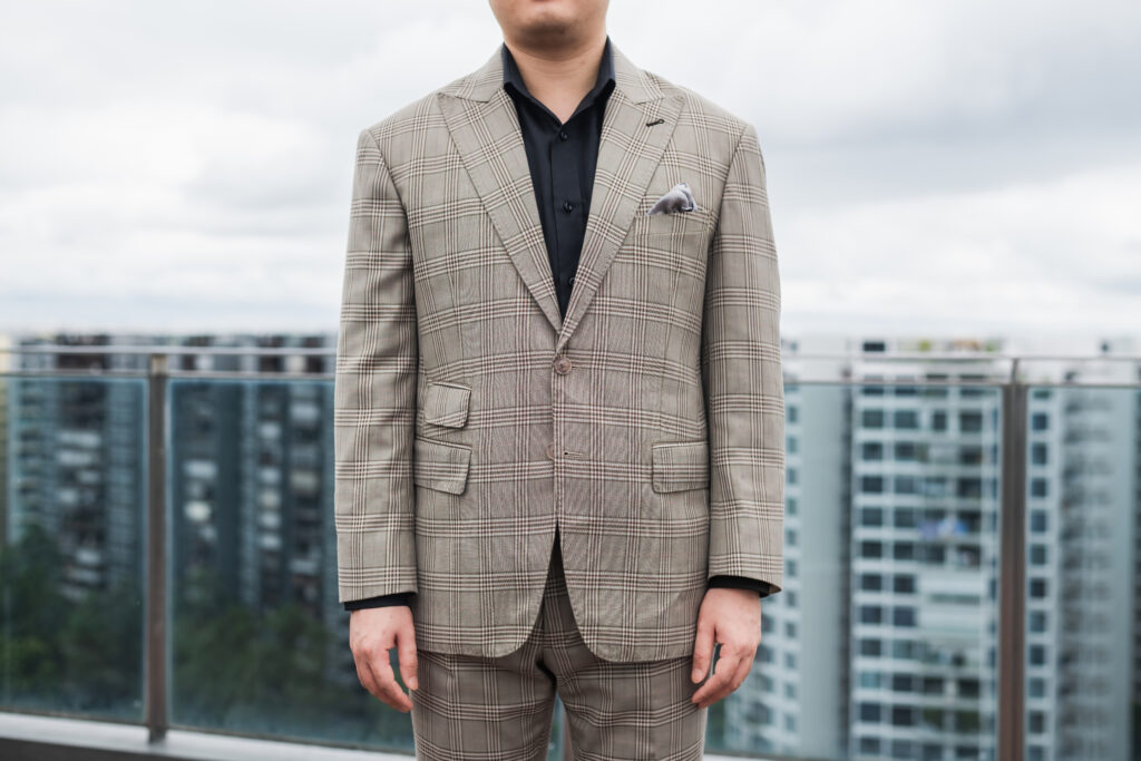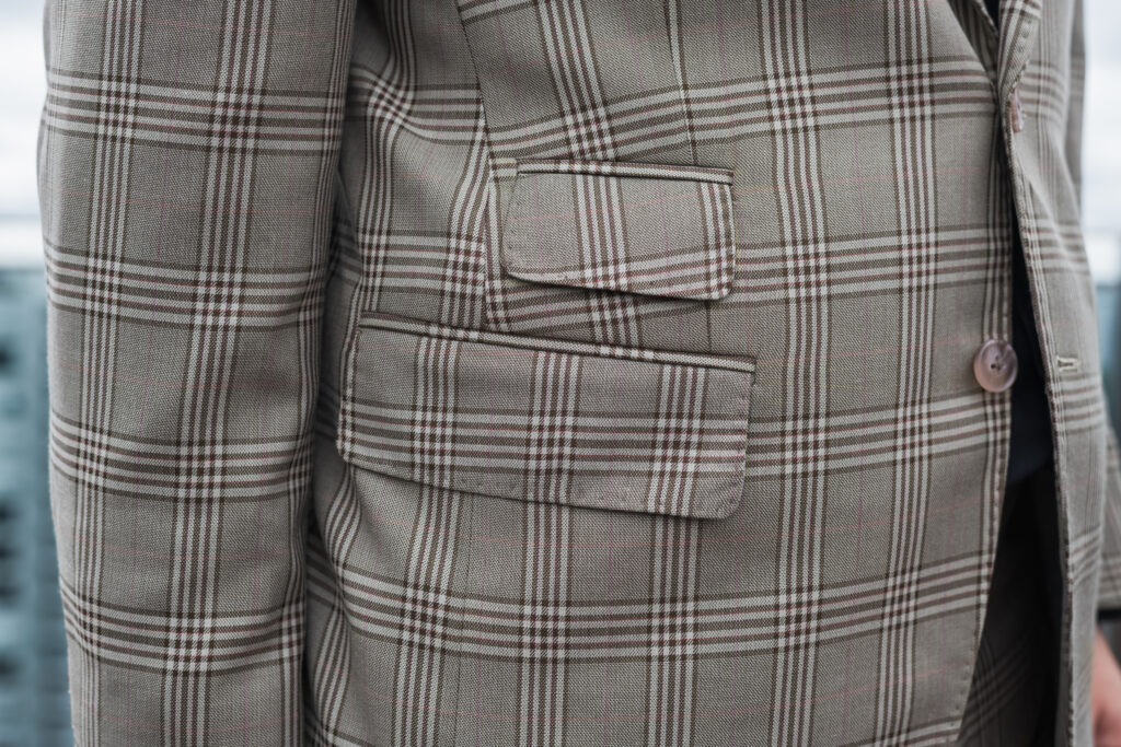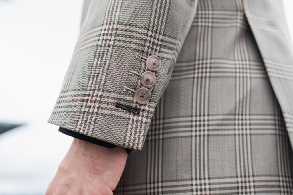 The suit is also finished with functional buttonholes—commonly referred to as surgeon’s cuffs—another marker of quality tailoring. The light-brown faux-horn buttons pair well with the grey checkered fabric, while the final buttonhole is picked out in black (again to complement the black shirt), subtly underscoring the suit’s custom-made character.