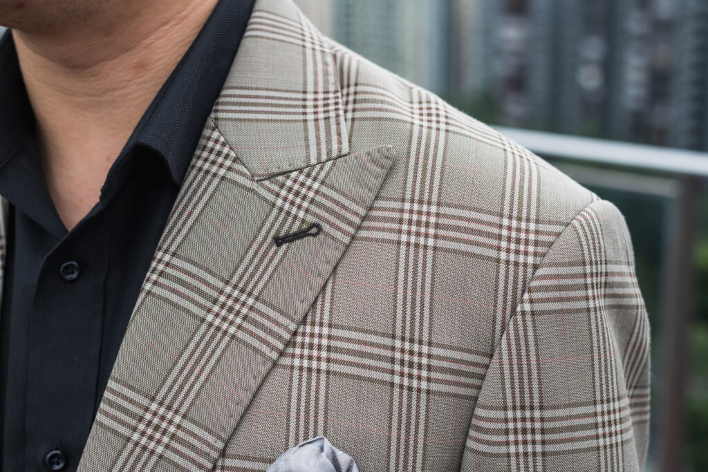 There are also several thoughtful finishing touches, including pick stitching along the lapel edges, a black contrasting lapel buttonhole to complement the shirt, and an integrated pocket square for added convenience. Pattern matching has clearly received due attention, with the checks aligned as precisely as possible.