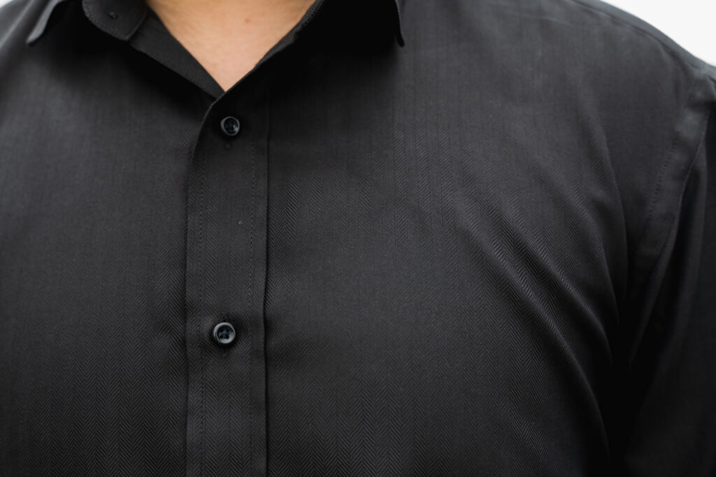 He then offered to drape the black shirt fabric over the grey checkered suit fabric, allowing me to visualise the pairing better. Seeing the combination in the mirror, I found it an intriguing choice: I own very few black shirts, and those I do have are typically worn with black suits. Pairing a darker shirt with a lighter suiting fabric felt refreshingly different, so I gave Anthony the go-ahead to proceed with these two fabrics.
