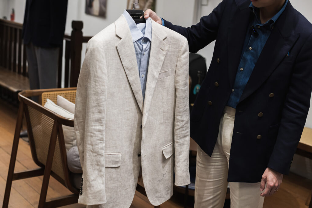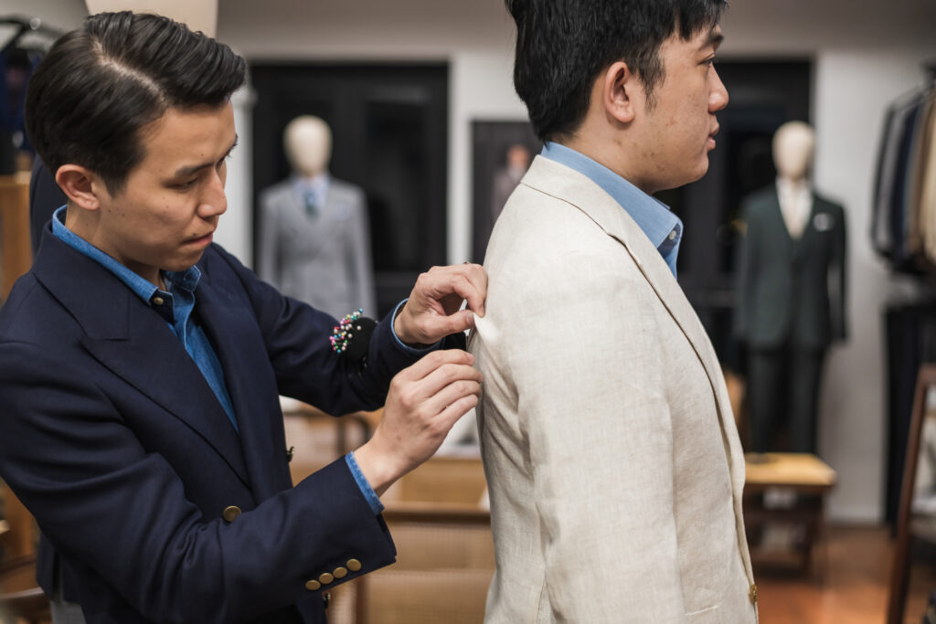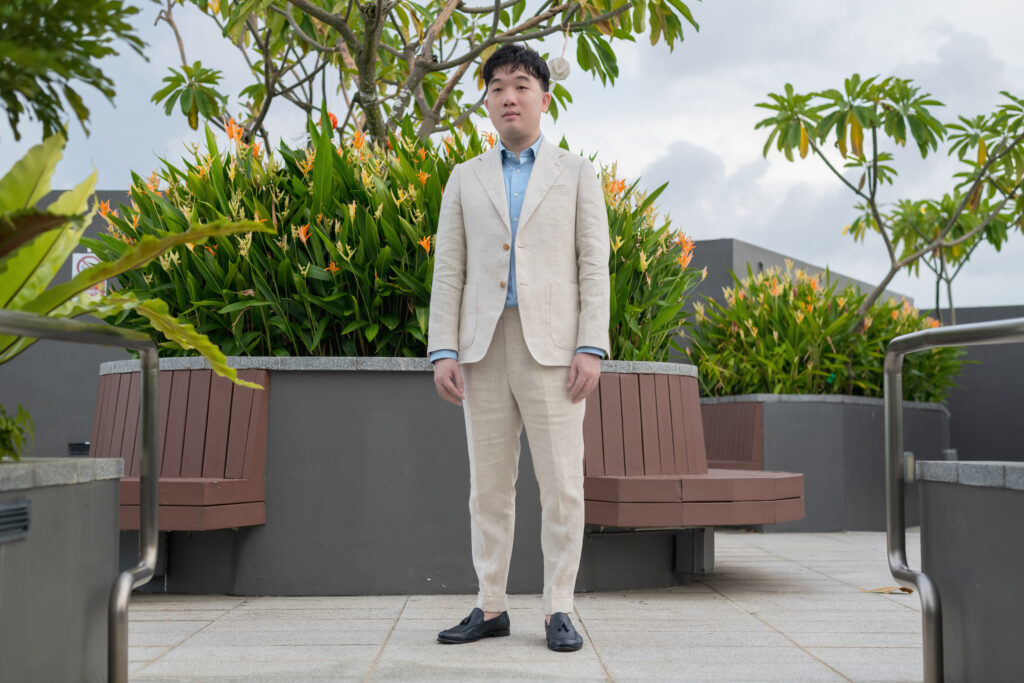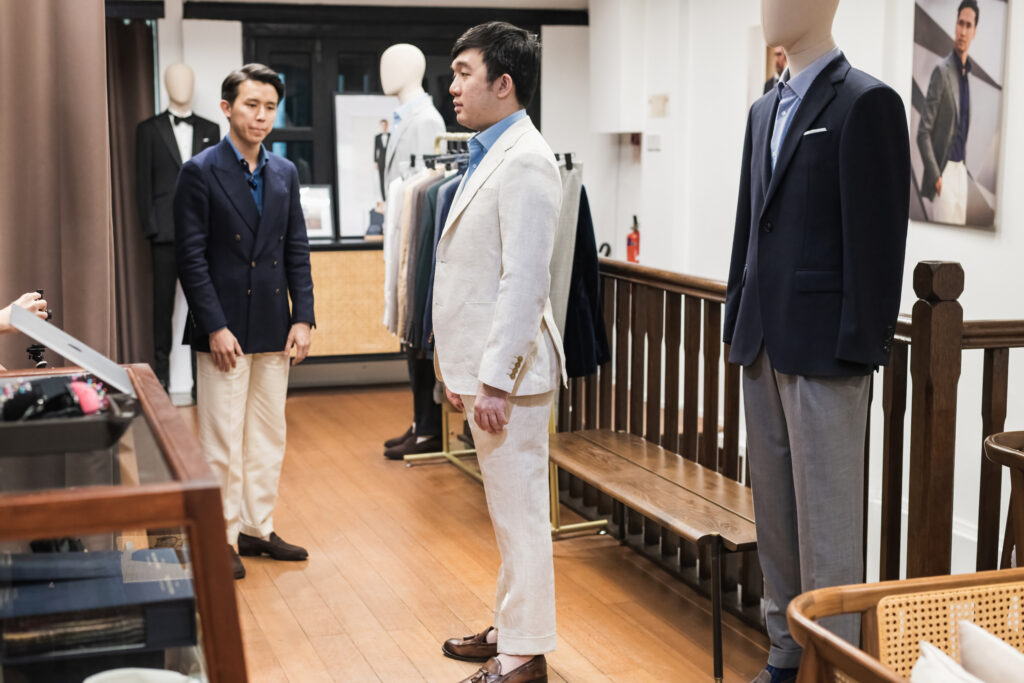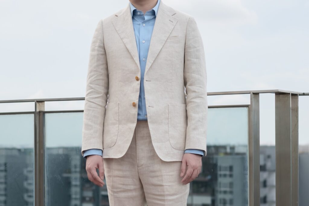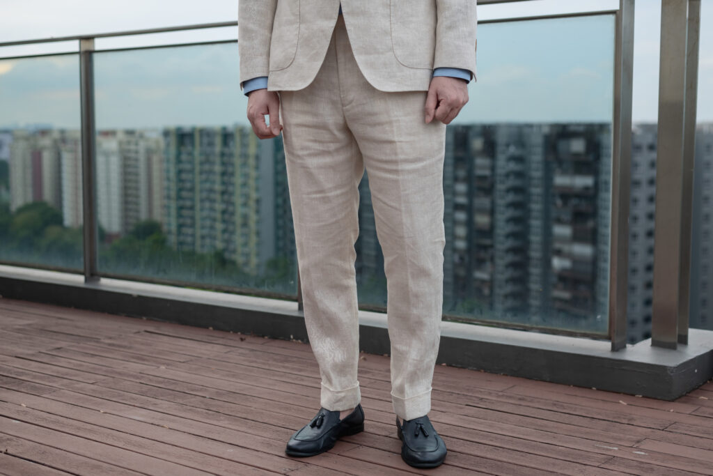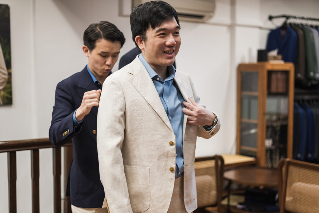 Glenn first recommended a linen suit — casual enough to function as an everyday staple, yet still breathable for Singapore’s climate. As I currently do not own many linen pieces, I decided to take his advice and selected a cream linen fabric.