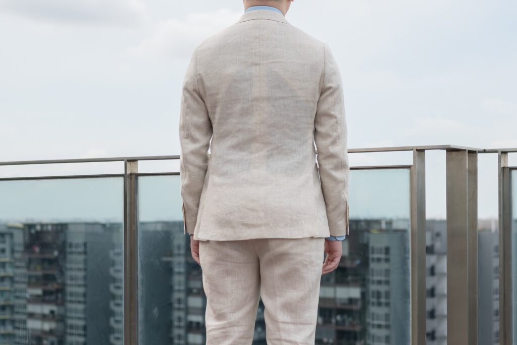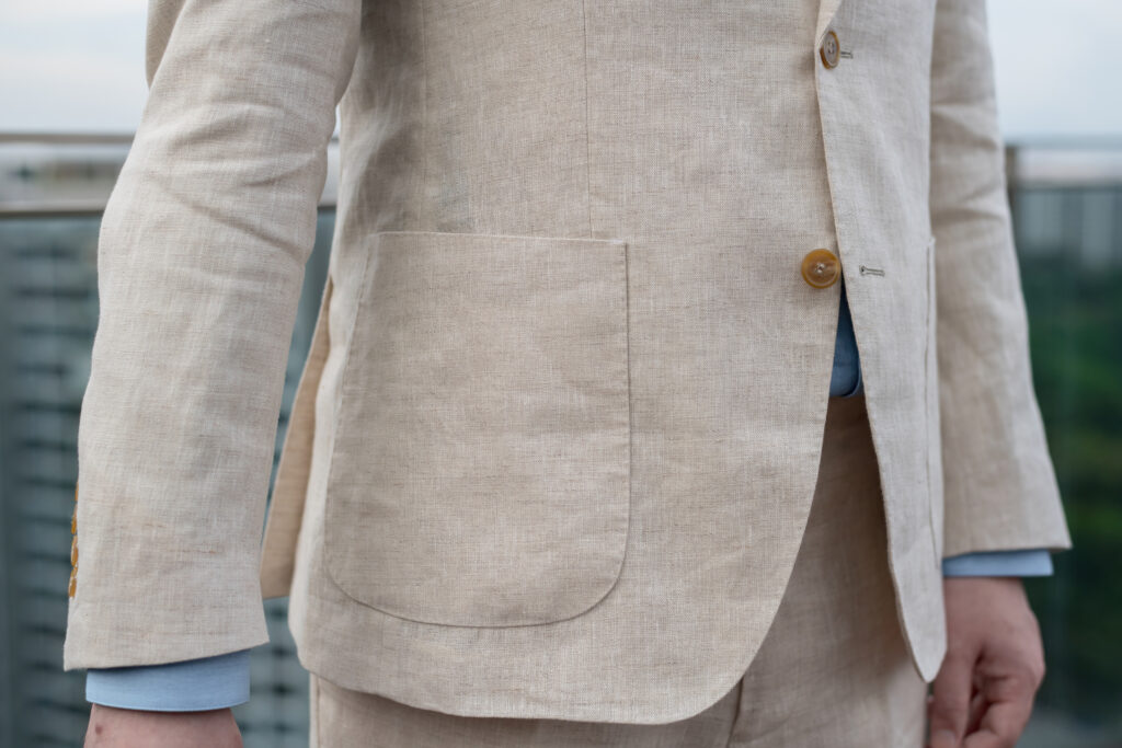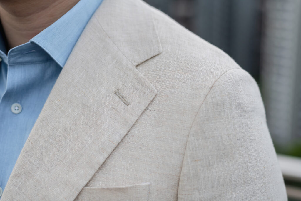 Moving on to the fabric, I’m absolutely enamoured with this textured cream linen. Although it comes from Edit Suits’ house linen collection—their entry-level range—it looks and feels remarkably premium. I also appreciate the off-white stitching on the lapel buttonhole, which subtly complements the fabric’s warm, earthy tones.