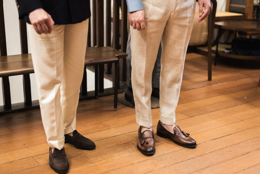 Next, Glenn proposed swapping the linen trousers for the grey wool pair. When combined with the linen jacket, the separated look appeared particularly sartorial and conveyed a strong sense of personal style. You can also see in the photo above how well the grey trousers drape — clean and streamlined.