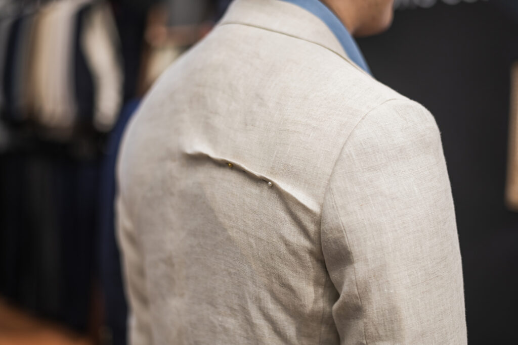 Lastly, I tried on the fitting jacket, which fit surprisingly well from the outset. That said, Glenn observed some wrinkling along the back and pinned the necessary areas to address it. He also noted that the jacket was slightly snug, and we agreed to release it slightly to allow for a bit more breathing room.