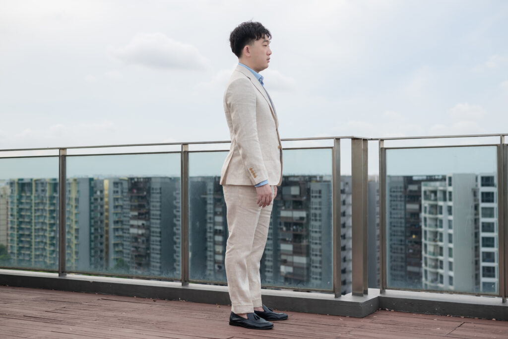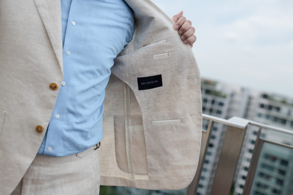 Meanwhile, the suit’s quarter-lined construction, combined with linen’s natural breathability, makes the jacket exceptionally airy and comfortable, even in Singapore’s humid climate.