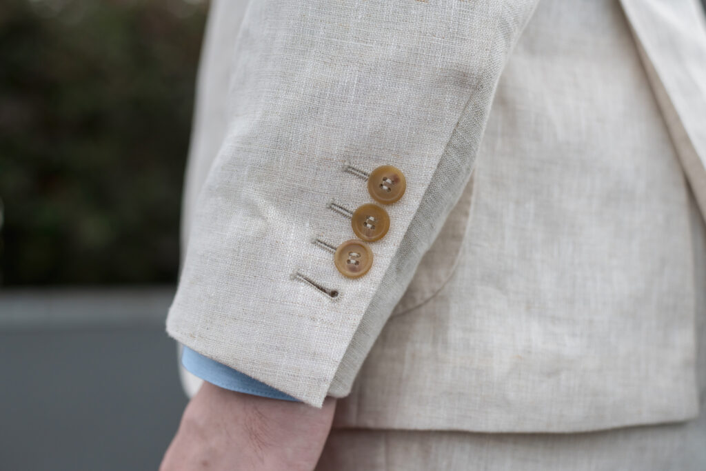 I also appreciate the light brown buttons, which enhance the earthy tones of the linen fabric. The jacket features functional cuffs—a hallmark of quality tailoring—and the buttonholes are neatly cut and finished, further reflecting the solid craftsmanship.
