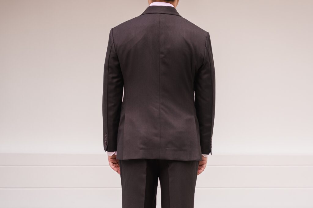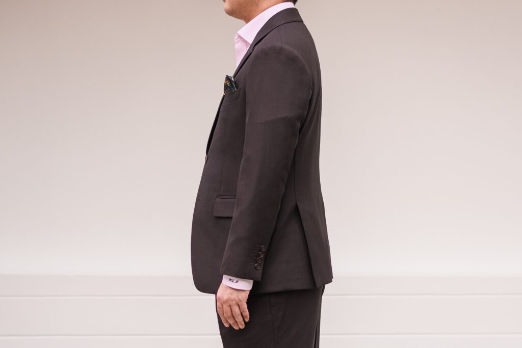 The jacket fits impeccably from the front, with shoulders that sit cleanly and free of wrinkles. Notably, there are no creases beneath the shoulder line—a testament to Jacob Bespoke’s precise accommodation of my naturally sloping shoulders. The suit drapes effortlessly, presenting a clean front with minimal creasing. The waist is subtly tapered for a refined, cinched silhouette, while the jacket length is spot on, finishing just below the thumb bone.