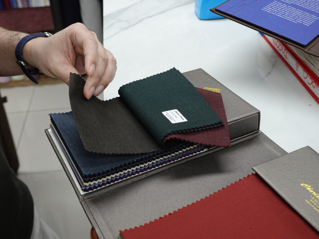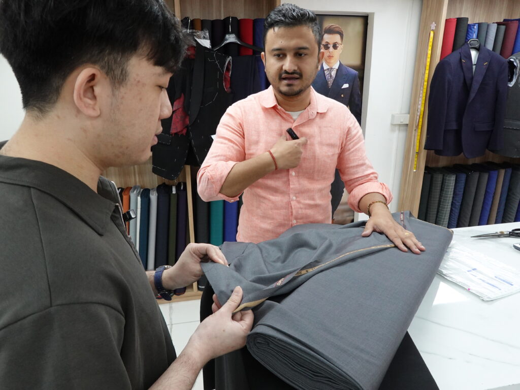 Upon entering the store, I was warmly greeted by Navin, who assisted me throughout the visit. As this was my first commission with Jacob Bespoke Tailor, I explained that I was looking for a relatively affordable fabric (under THB 10,000) in a safe, versatile colour. In response, Navin brought over several fabric options, including a textured medium-grey cloth.