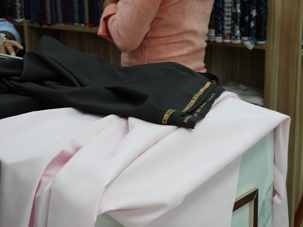 With the suiting fabric decided, we moved on to the shirting. Rather than relying on small swatches from fabric books, David brought out full shirting rolls—in shades of pink, blue, and purple—and placed them alongside the brown suiting cloth, making it far easier to visualise the final pairing.