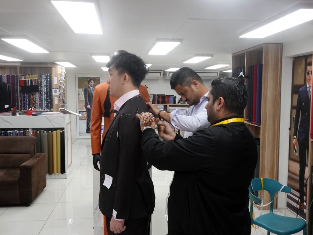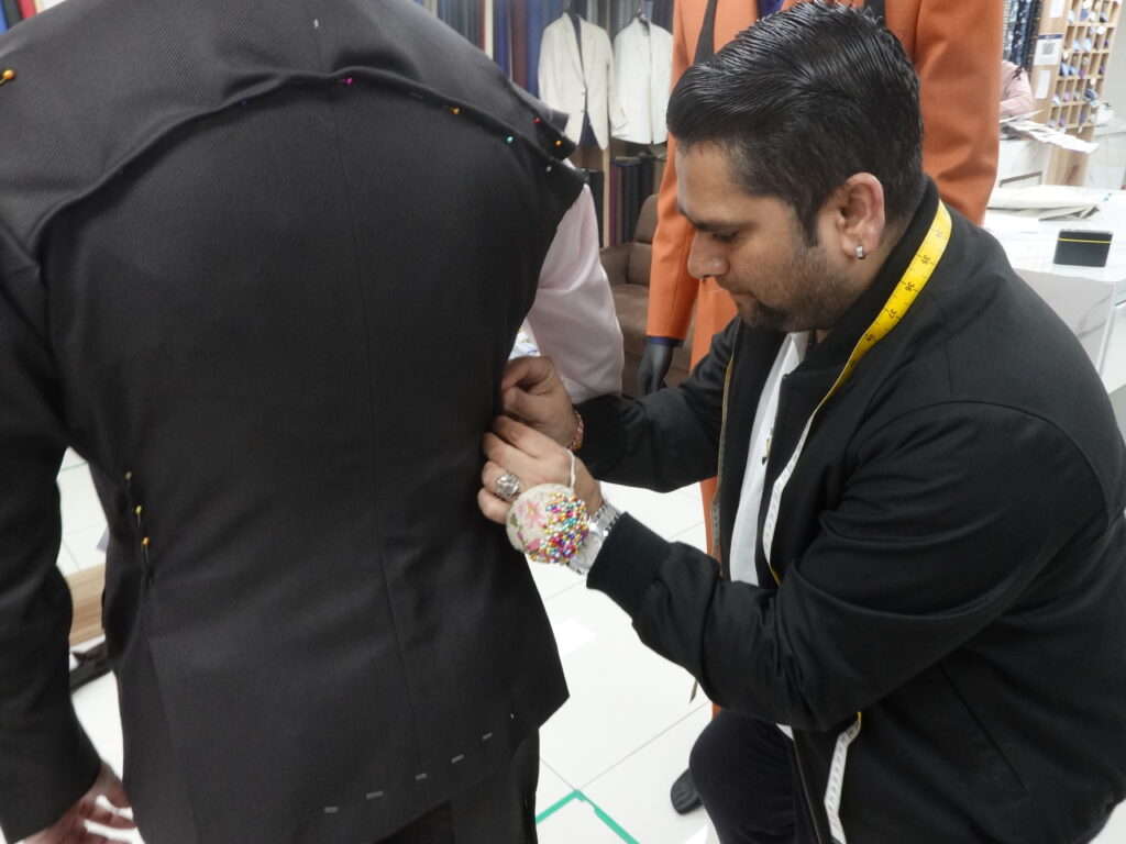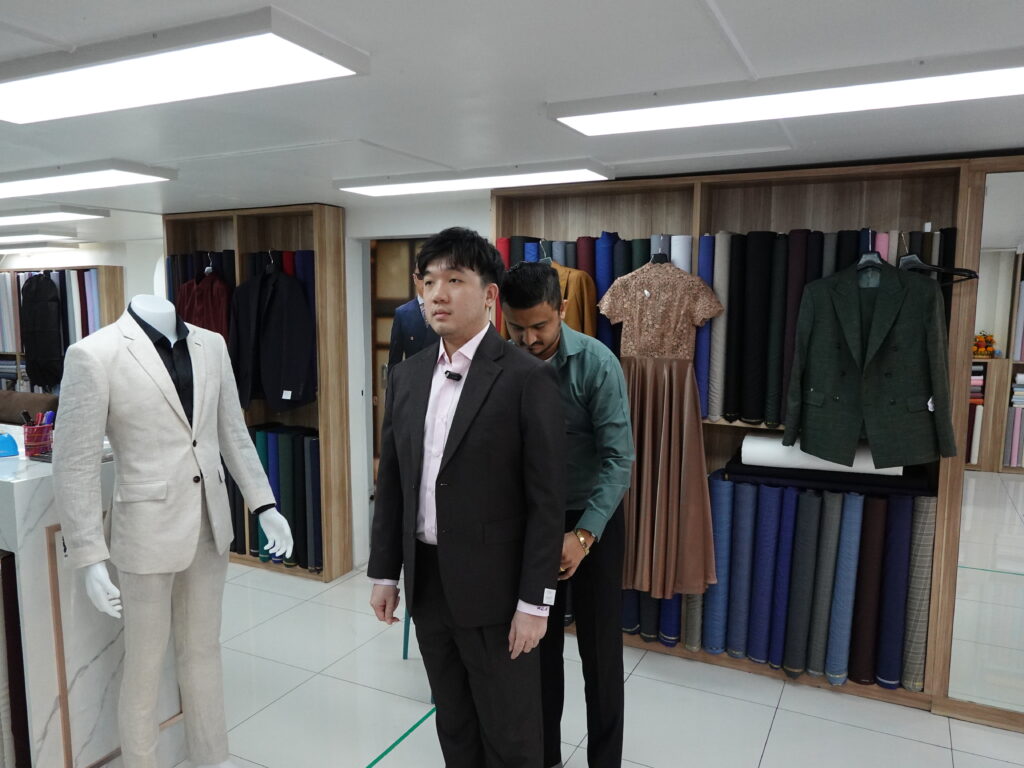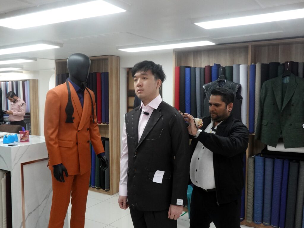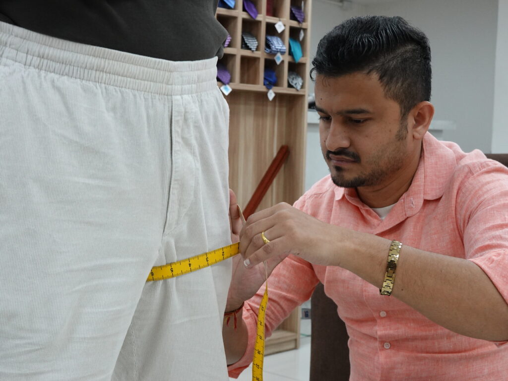 The measurement process at Jacob Bespoke is straightforward and traditional, carried out with a simple measuring tape under Navin’s watchful eye. There’s no reliance on fancy technology—just the time-tested method of manual measurement.