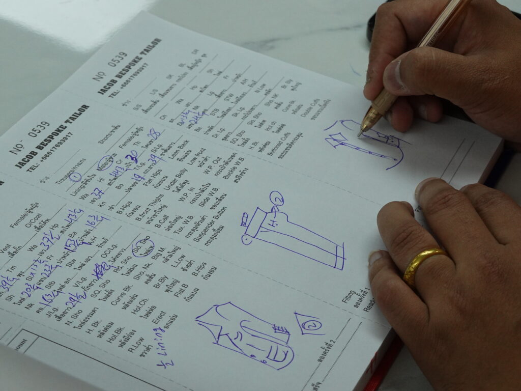 After taking the initial measurements, Navin double-checked the customisation details with me, sketching out elements such as side adjusters, trouser cuffs, and notch lapels. It was a thoughtful, analogue touch that nicely complements the inherently anachronistic nature of bespoke tailoring.