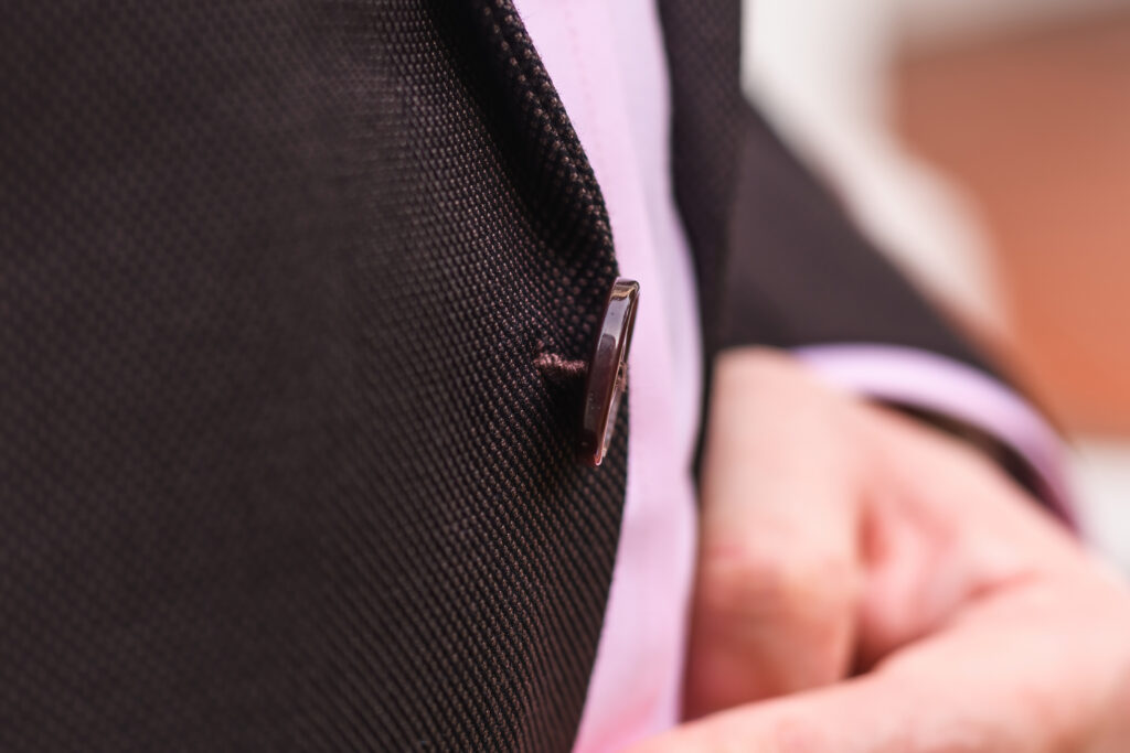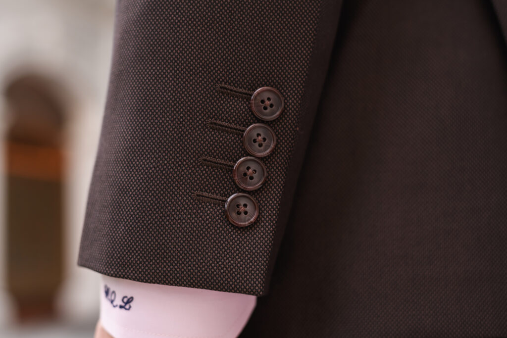 For the buttons, we kept things understated, choosing brown for a subtle, tone-on-tone effect. The only drawback is that the cuffs aren’t functional, which is a slight disappointment.