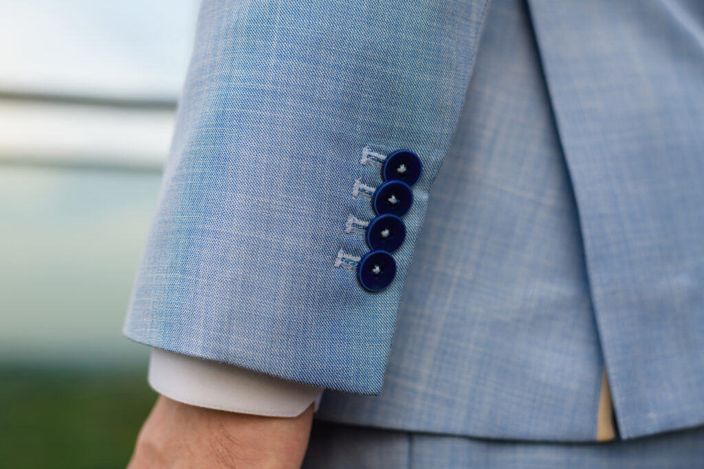 I’m also fond of the navy buttons, which create an elegant tone-on-tone contrast against the light blue cloth. They are arranged in a ‘kissing’ configuration—another subtle sartorial detail appreciated by the discerning eye. The buttonholes are fully functional as well, a hallmark of quality tailoring often referred to as a surgeon’s cuff.