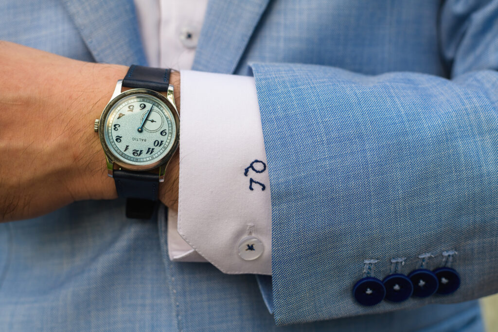 As for the shirt cuff, the monogram turned out nicely too, with the blue stitching complementing the navy buttons (and my Baltic MR01 watch) well.