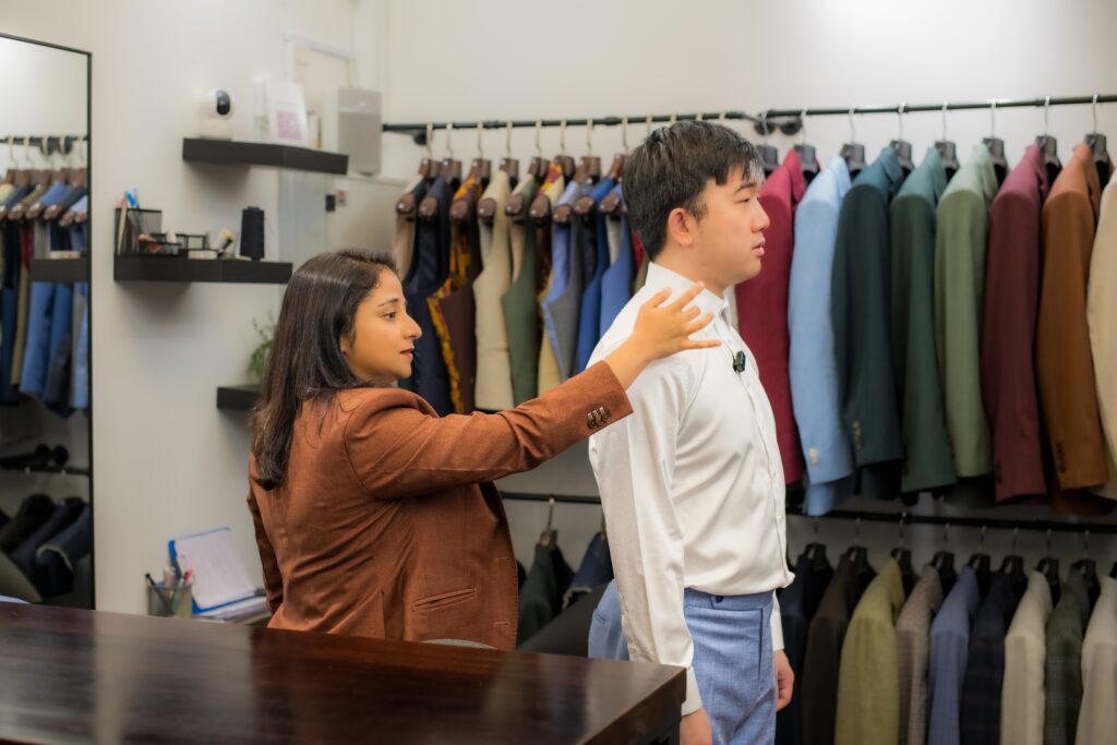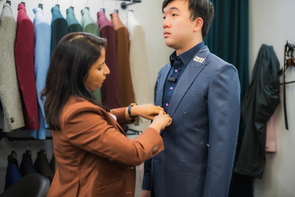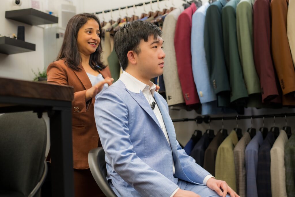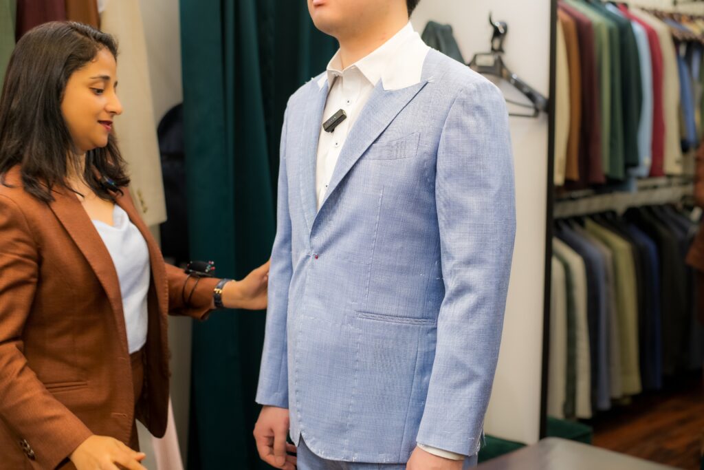 Since I had mentioned that the suit felt tight during the muslin fitting, Tulsi went a step further by asking me to sit down, allowing me to better assess the jacket’s comfort.