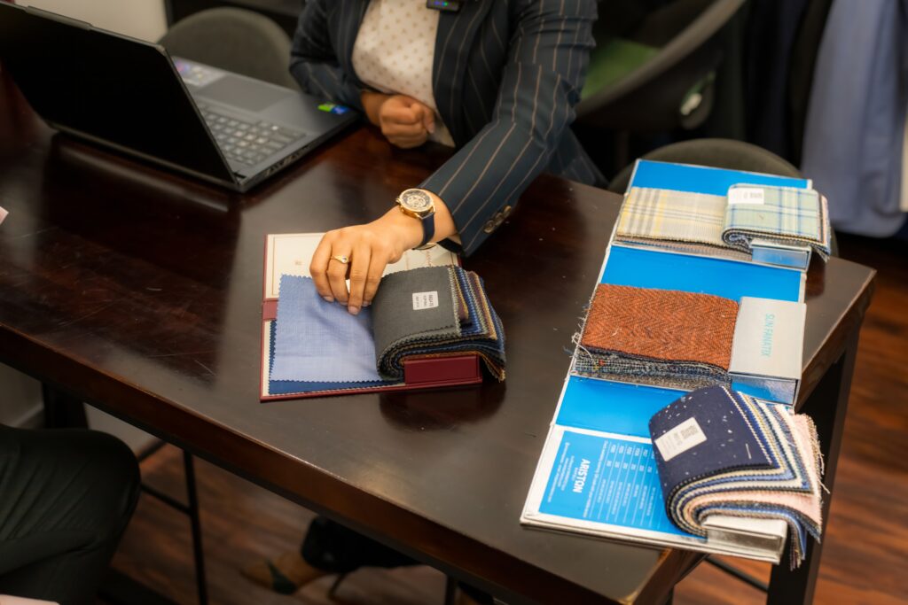 From there, we returned to the fabric books. Once again, Tulsi took the lead, drawing my attention to a range of more casual options, including glen checks, linen, and even tweed.