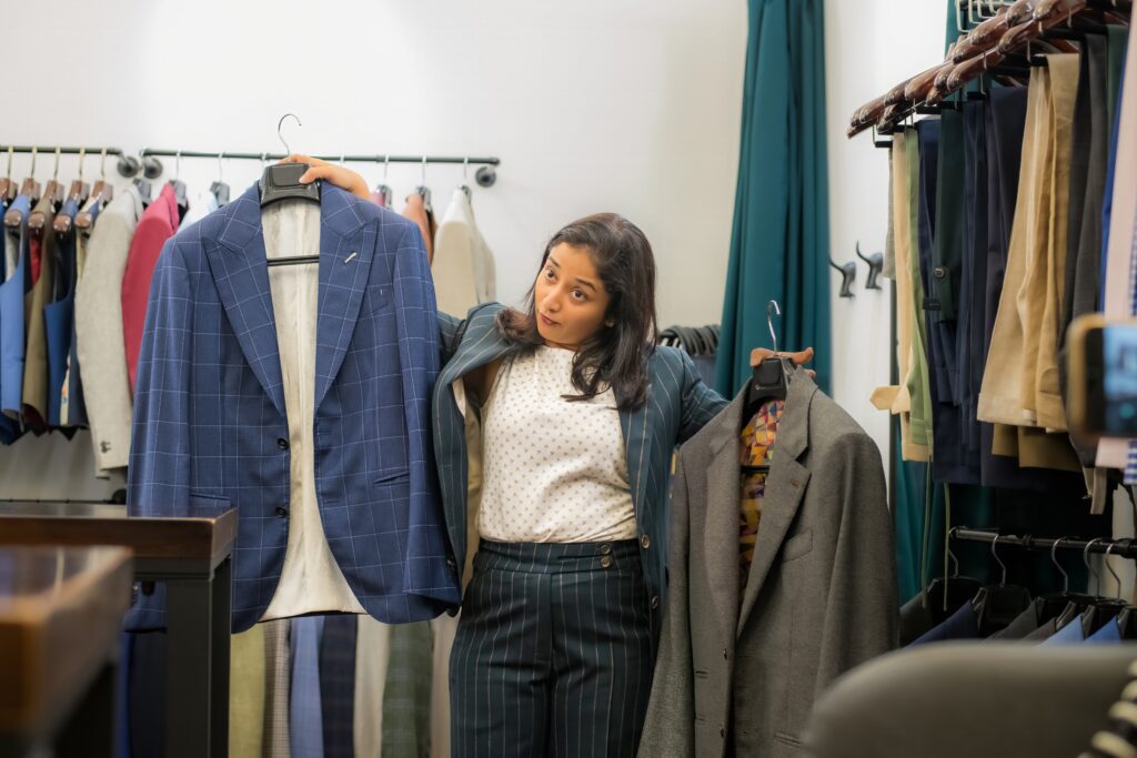 One trait that distinguishes Tulsi is her preference for showing rather than telling. She first selected a green checkered jacket and asked if I might be interested in a similar shade or pattern—though I ultimately declined, as the look felt a little too European for my taste.