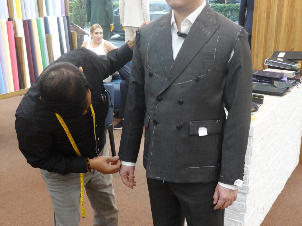 After two days, I returned to Perfect Tailor BKK for my basted fitting. For those unfamiliar with the process, a basted fitting involves trying on a skeletal version of the jacket, held together with temporary white basting stitches. To learn more about the basted fitting, read this educational article here. Personally, I believe that a basted fitting is essential to a true tailoring experience. To quote a line from the article mentioned above: “It’s the difference between flying first class and flying on a private jet.”