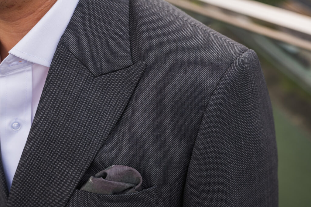 Turning to the fabric, the charcoal mixed-wool birdseye cloth is particularly striking, lending subtle visual interest to an otherwise mature aesthetic. I have developed a growing appreciation for the birdseye pattern in recent commissions, and I remain drawn to the distinctive texture it offers. It is far less ostentatious than checks, windowpanes, or pinstripes, yet delivers a level of refinement that surpasses a plain solid. Elsewhere, the peak lapels are entirely in keeping with a classic double-breasted suit, while the integrated pocket square adds a practical touch.